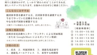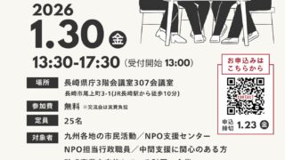九州各地の市民活動支援専門員による個別相談会を開催します!今回は災害ボランティアネットワークの構築についての相談会となっております。開催概要日 程:2026年2月20日(金)時 間:14:00〜17:00会 場:長崎市市民活動センター参加費...