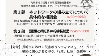 研修会・講座・交流会情報 【参加受付中】2/20(金) 専門員による「市民活動相談会」 長崎市災害ボランティアネットワークの構築のために必要なこととは?~よりよい被災者支援のため~