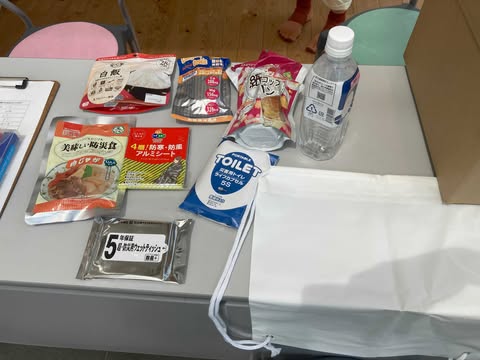 参加者1人につき、災害時非常食等1日分をプレゼント。そのうち、箱の中から1食分を取り出して、みんなで試食して「非日常」となる災害時に「非常食」を食べてどう感じるかを体験します。