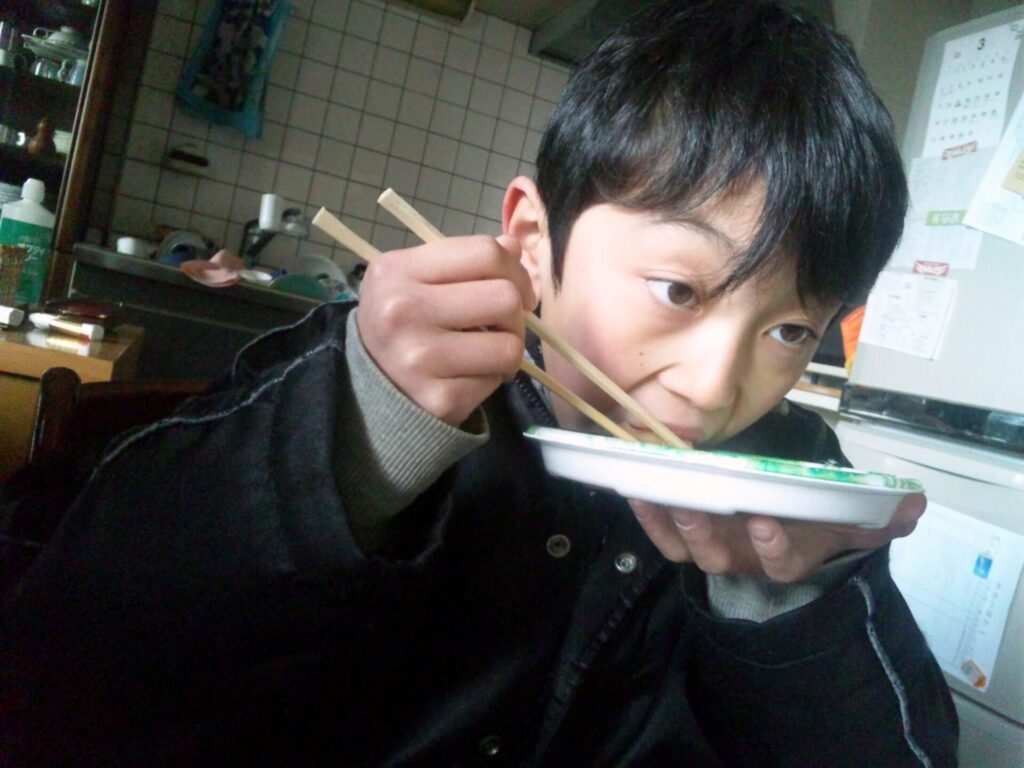 炊き出しを食べる子ども。灯油を節約するため、夜寝る時も日中もジャンパーは着たまま。部屋を暖めるにも、温かい汁物を作るにも…(2011年3月13日撮影)