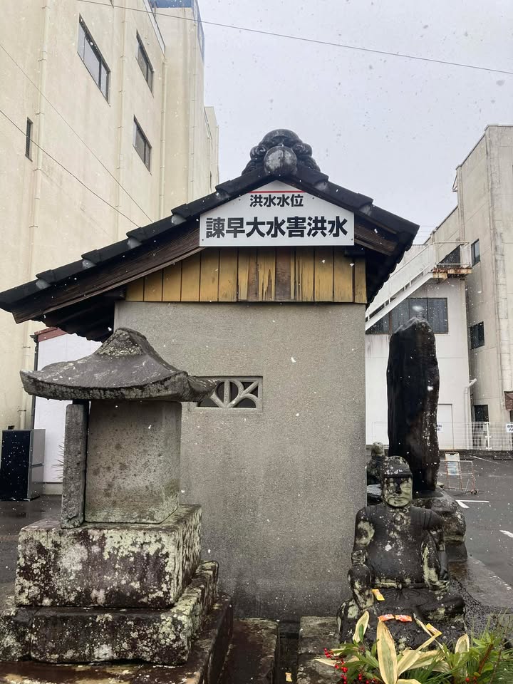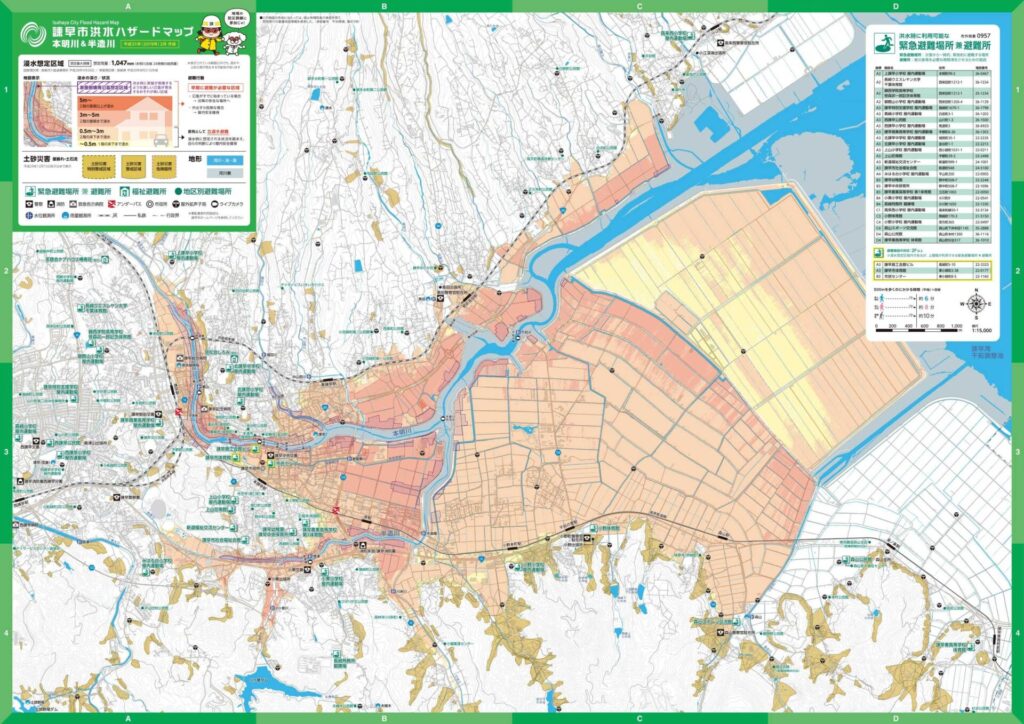 水害と聞いてもどのくらいの被害があるのかわからないと思ったので、諫早市がホームページに掲載している洪水ハザードマップと昭和32年7月25日の諫早大水害時の水位の記録写真を見てもらいました。